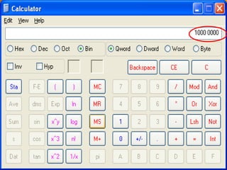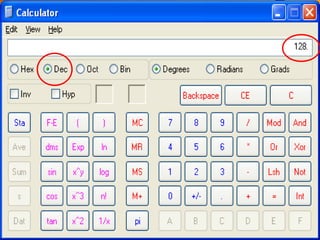 The document discusses binary numbers and how computers use the binary system to store information. It explains that binary uses only two digits, 0 and 1, to represent all data. Eight bits make up one byte of data, and bytes can be combined to larger units like kilobytes and megabytes. It provides examples of how to determine the decimal value of a binary number by adding up place values for each 1 digit from right to left.