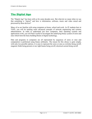 The document provides an overview of binary systems and how computers use binary to represent data and perform computations. It begins by explaining that computers represent all data and programs as sequences of zeros and ones, using binary rather than decimal. It then discusses the decimal numbering system to provide context for explaining binary. The bulk of the document defines the binary system, how numbers are represented with powers of two, and how to convert between decimal and binary numbers with examples. It concludes by discussing how computers work with groups of bits and standard units of data storage.