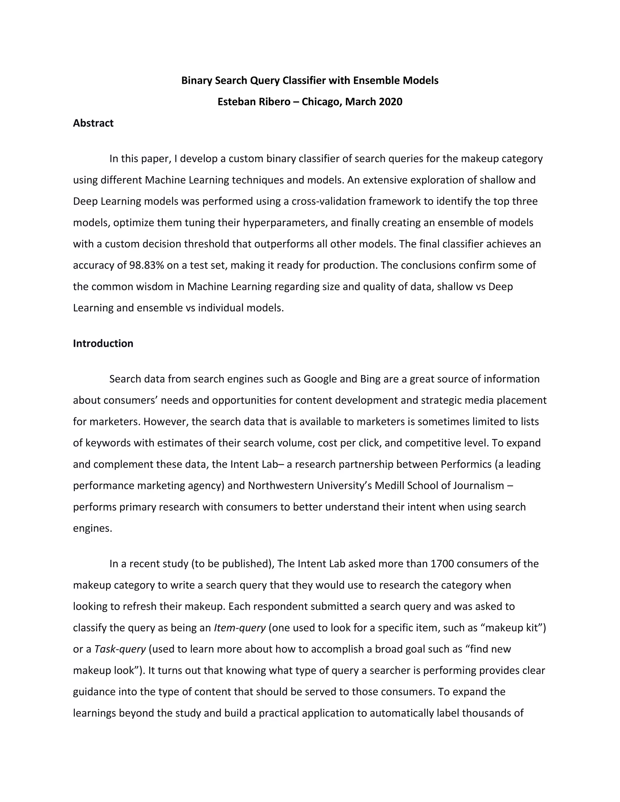 The paper develops a custom binary classifier for search queries in the makeup category using various machine learning techniques, achieving an accuracy of 98.83%. It highlights the importance of data quality and the effectiveness of ensemble models in classification tasks. The findings are based on an extensive study of consumer search queries, leading to a balanced dataset and comprehensive modeling approach.