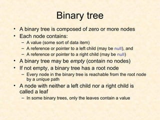 A binary tree is composed of nodes where each node contains a value and pointers to its left and right children. A binary tree traversal involves systematically visiting each node by traversing either breadth-first or depth-first. Breadth-first traversal visits nodes by level while depth-first traversal can be pre-order, in-order, or post-order depending on when the node is visited. Threaded binary trees reduce the number of null pointers by using them to point to other nodes for more efficient traversals.