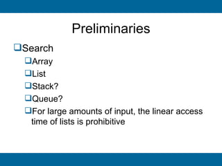 The document discusses binary search trees and their implementation. It begins by defining binary trees and their properties. It then describes how binary search trees work, with the key property that for every node, all keys in its left subtree are smaller than the node's key and all keys in its right subtree are larger. It provides pseudocode for basic binary search tree operations like search, insert, delete, find minimum and maximum. Finally, it introduces AVL trees, which are self-balancing binary search trees that ensure fast lookup by keeping the height of left and right subtrees close.