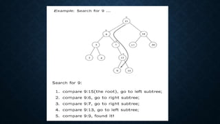 The document describes binary search trees (BST), detailing their properties, structure, and algorithms for searching, insertion, and deletion. It highlights how elements in a BST must adhere to specific ordering rules based on their relationship to the root node. Additionally, it discusses the computational complexity of various operations in a BST and its applications in data management and search tasks.