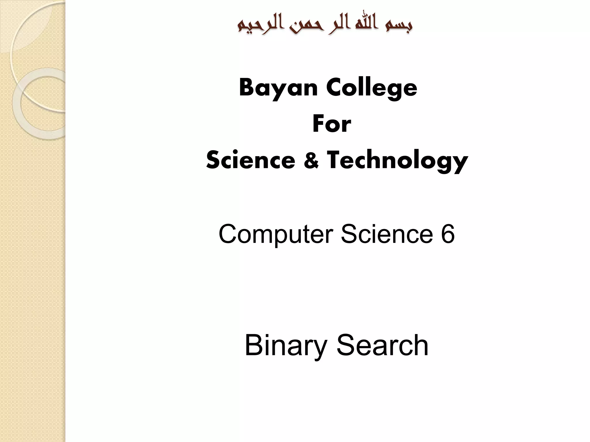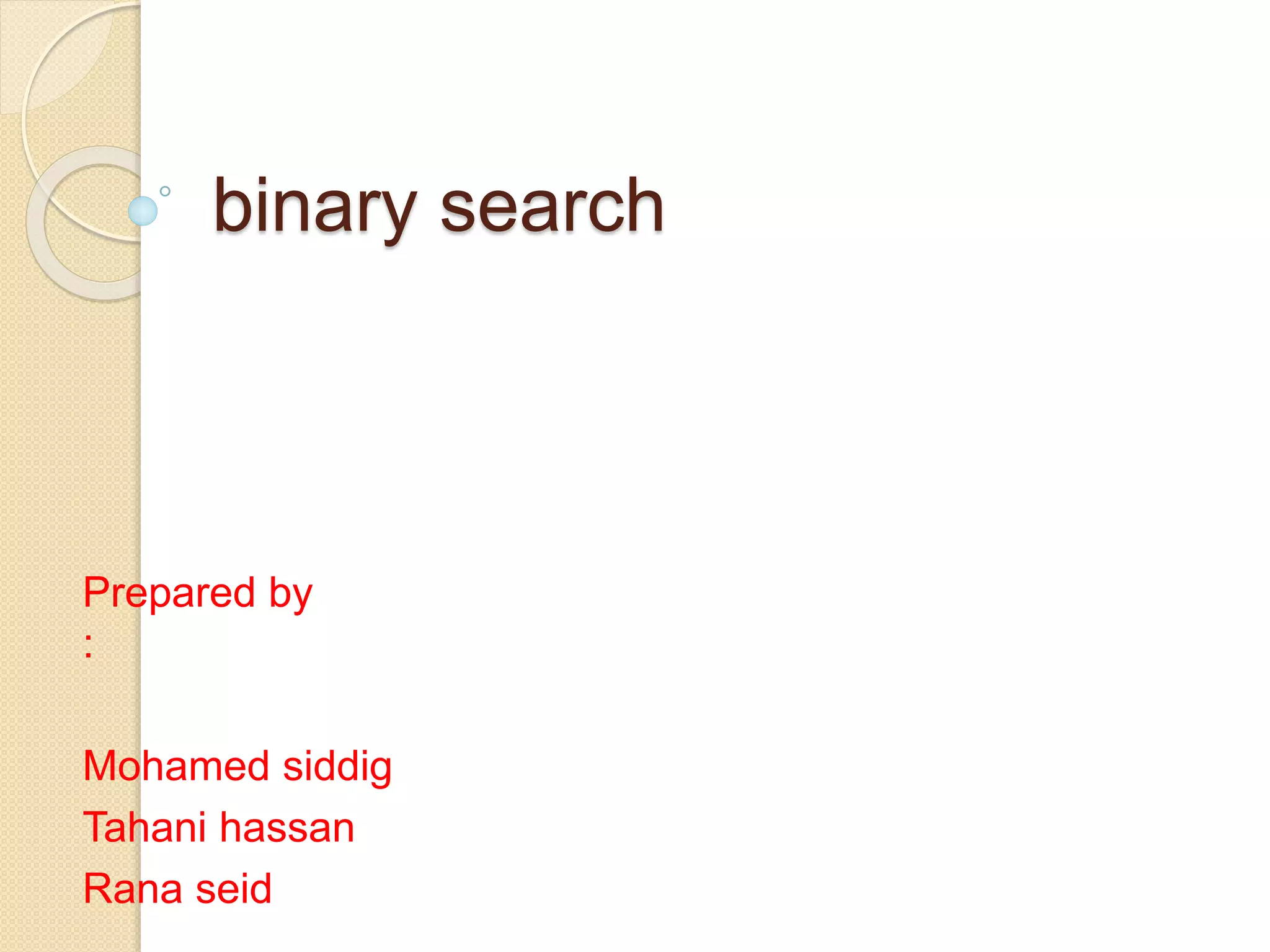 Binary search is an efficient algorithm for finding a target value within a sorted list or matrix. It works by repeatedly dividing the search space in half and eliminating half of the elements from consideration. The steps are: 1) sort the array, 2) set boundaries for search space, 3) check middle element and eliminate half based on comparison to target, 4) repeat until target is found or eliminated. It has best case performance of O(1) when finding the target on the first try, and worst case of O(log n) when searching the entire space. Binary search is commonly used to quickly find values in applications like computer games.
