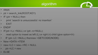 - Algorithms are presented for inserting nodes using linked lists and merging two trees by combining their nodes.