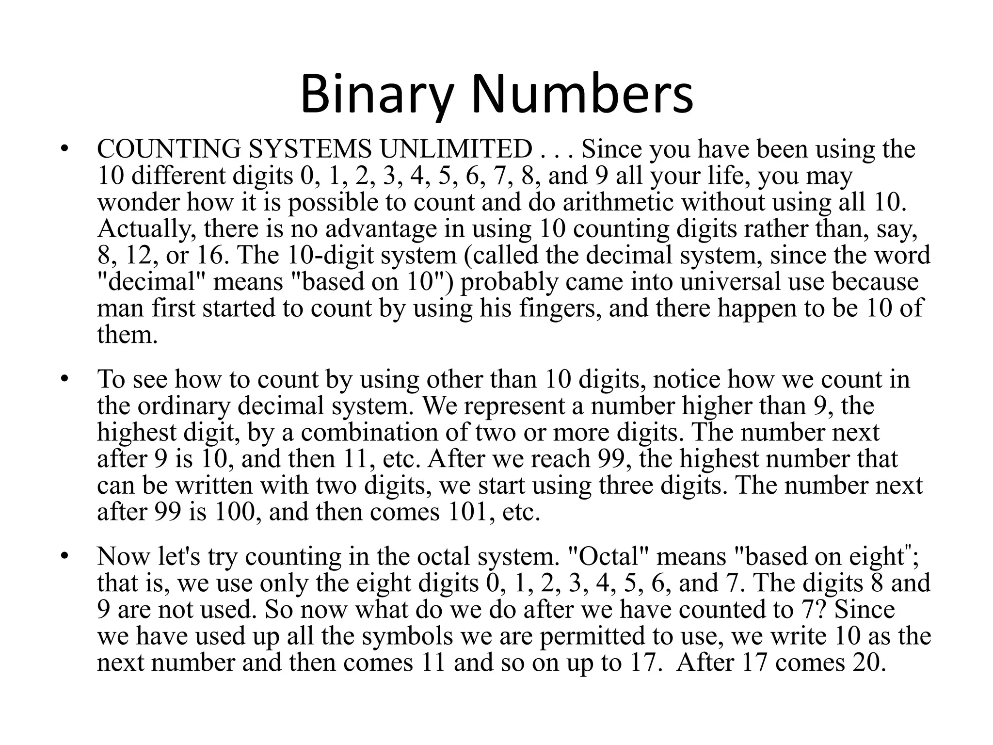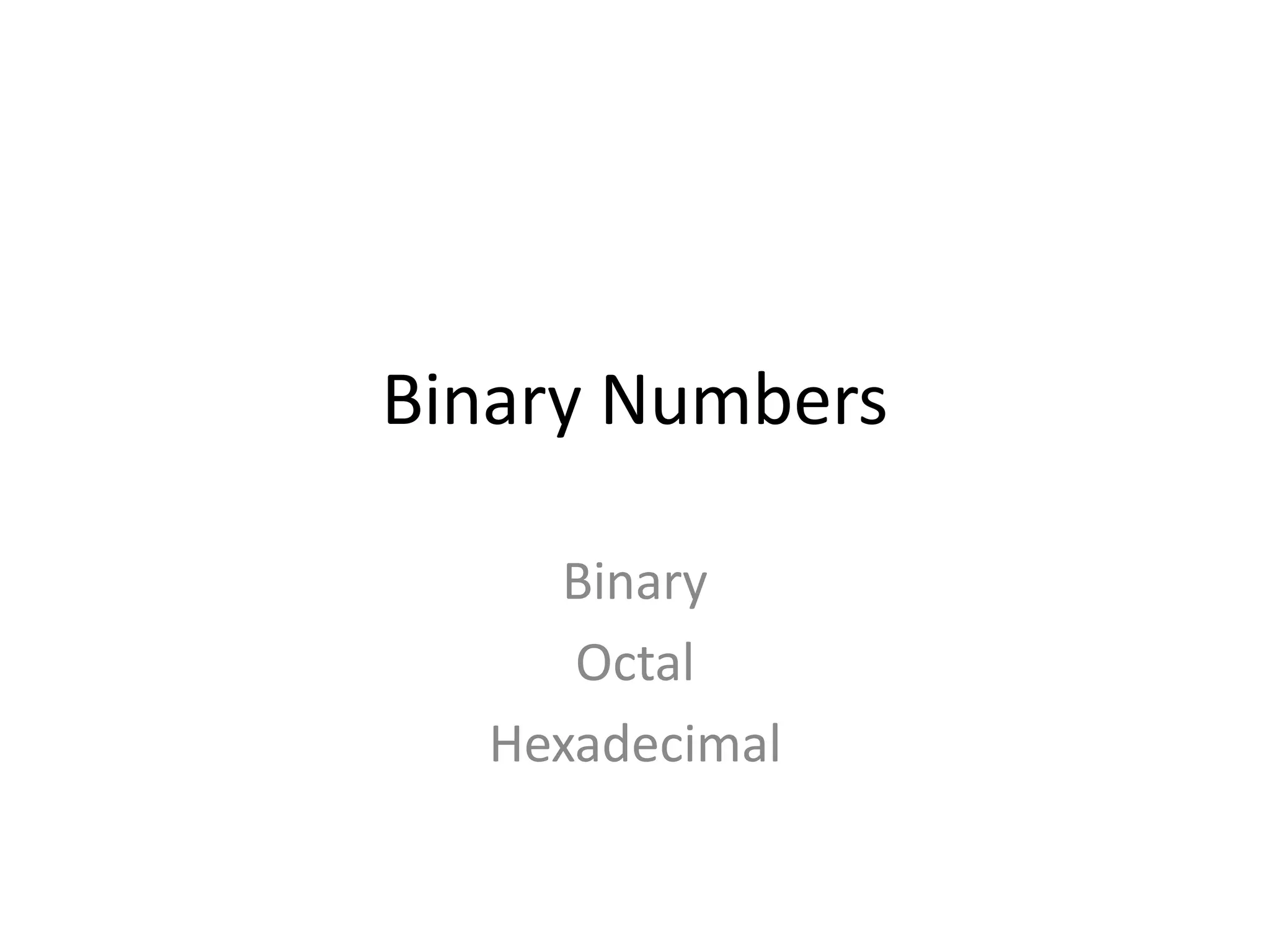 Binary numbers can be represented using only two digits, 0 and 1. The binary system counts in powers of two, with the value of each digit place increasing by a factor of two from right to left. Binary numbers can be converted to other bases like octal and hexadecimal for convenience. Octal uses digits 0-7, grouping binary digits into sets of three. Hexadecimal uses digits 0-9 and letters A-F, grouping binary into sets of four. Converting between number bases involves rewriting the binary number into the appropriate groupings and finding the decimal equivalent of each group.