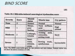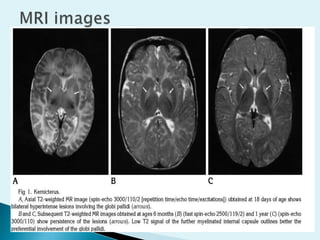 - Kernicterus presents as acute bilirubin encephalopathy with symptoms ranging