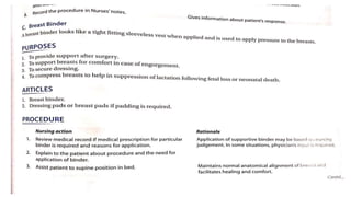 Breast binding is the act of flattening breasts using constrictive materials like cloth strips, elastic bandages, purpose-built undergarments made of spandex, or layered shirts. It is commonly practiced by trans men to reduce breast size but is also done by non-binary or androgynous individuals. Purpose-built chest binders made of spandex exist for breast binding and are generally safer than alternatives but can be more expensive and less accessible.