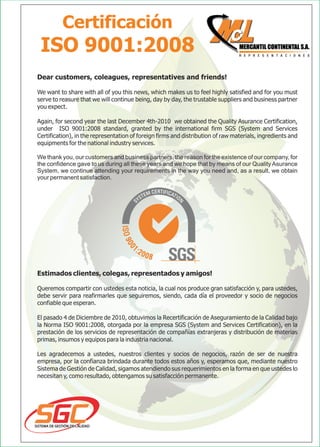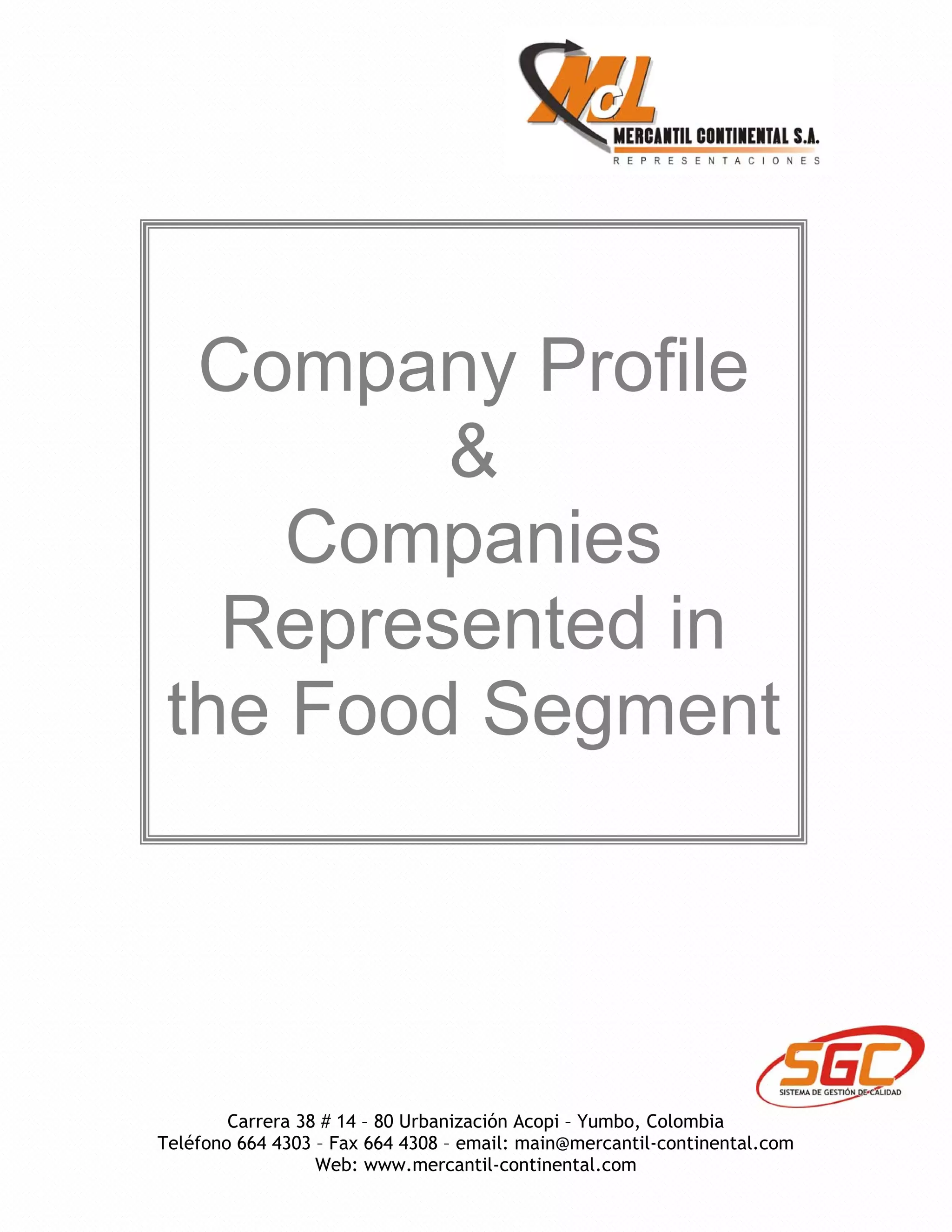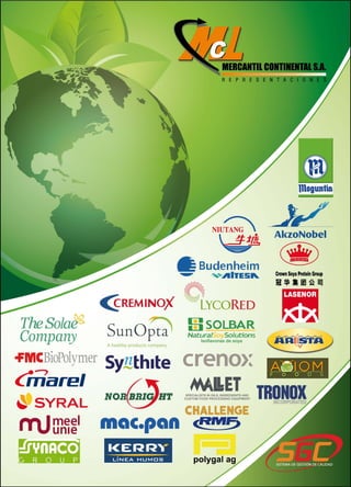 Mercantil Continental S.A. is a Colombian company founded in 1973 that imports and distributes specialty chemicals, food ingredients, and represents foreign companies in Colombia. It represents over a dozen international suppliers across industries like chemicals, food, and packaging. The company has its headquarters in Cali, Colombia with additional offices in Bogota and Medellin, and focuses on importing and distributing food ingredients from major global suppliers to customers in Colombia.