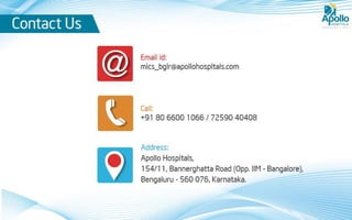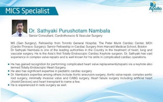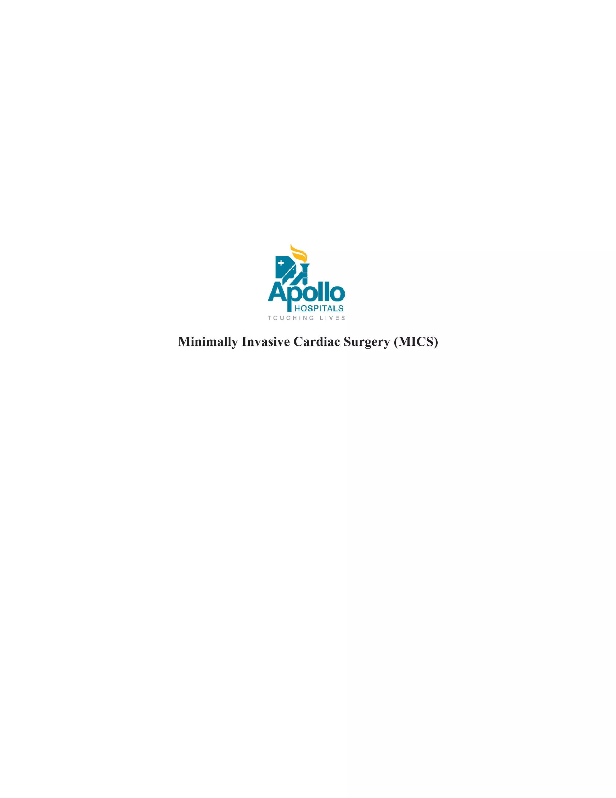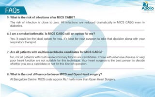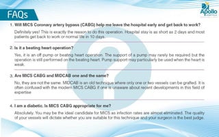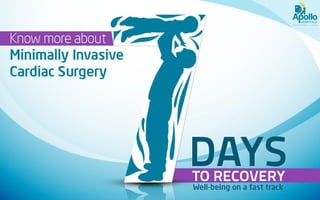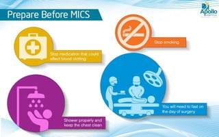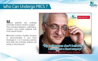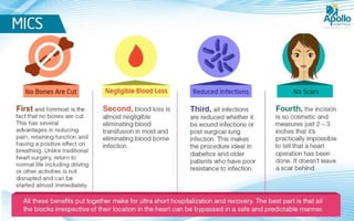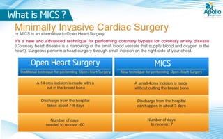 Minimally invasive cardiac surgery (MICS) is a surgical technique performed by Apollo Hospitals that uses smaller incisions and specialized instruments to access the heart instead of opening the chest with a large sternum-splitting incision. MICS results in less post-operative pain, shorter hospital stays, and faster recovery times for patients compared to traditional open-heart surgery. The document then provides links to Apollo Hospitals' social media profiles and blog.