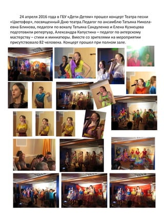 В 2016 году гбу 'дети-детям' организовало ряд концертов и мероприятий, включая выступления театра песни 'цветофор', посвященных важным датам и событиям, таким как День театра и 71-я годовщина победы. Концерты включали участие учеников и ветеранов, и проходили на различных площадках с большим количеством зрителей. Мероприятия также включали праздники для детей и выступления на выборах, подчеркивающие культурное значение и вклад молодежи в общественную жизнь.