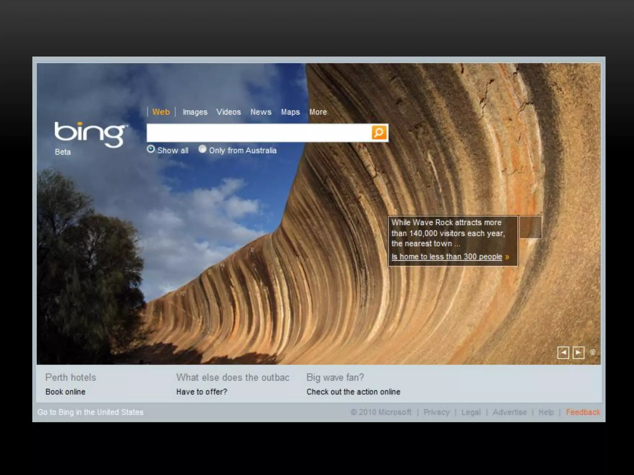 This document provides an overview of Bing search capabilities presented by Mark Vozzo of Microsoft. It includes demos of augmented reality, paid search analytics, enhanced search previews using Wikipedia, visual search, weather comparisons, travel search, math computations using WolframAlpha, and map applications showing photosynth, the World Cup, and streetside photos. Vozzo also discusses Bing partnerships and integration with MSN Entertainment and Foursquare. Requirements to run demos include Internet Explorer 8 and Silverlight 3.