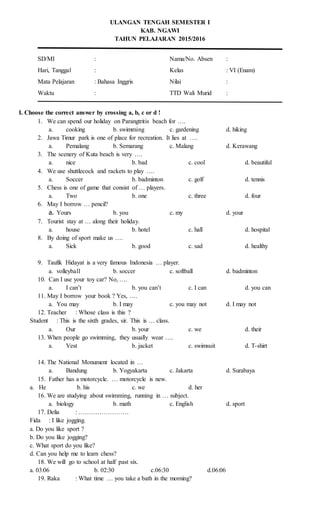 1) The document is a mid-semester exam for 6th grade students in Nganwi, Central Java for the 2015/2016 school year testing their English ability.