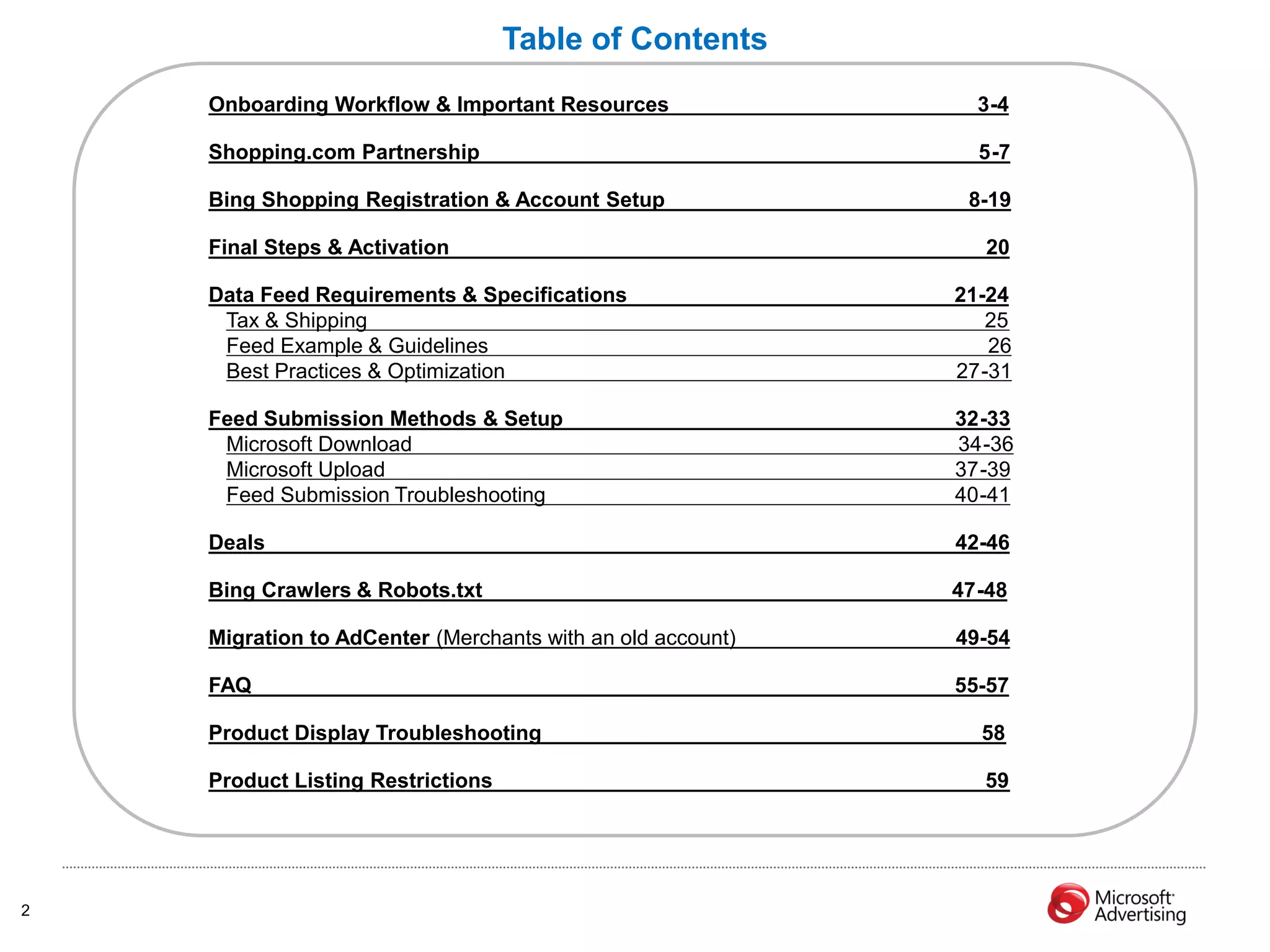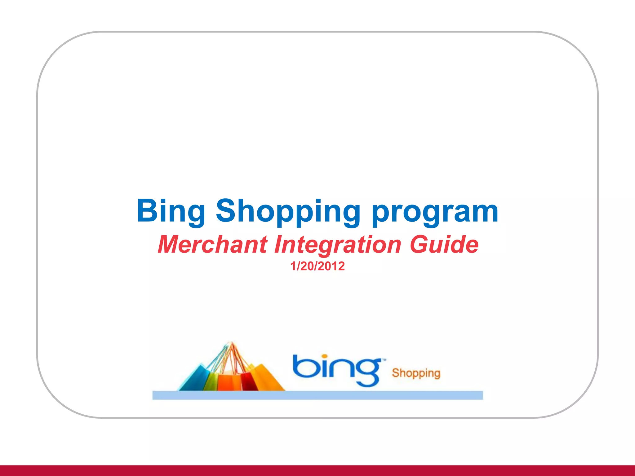 This document provides guidance for merchants to list products on the Bing Shopping program. It outlines the onboarding workflow and account setup process, which involves registering for an AdCenter account, creating a Bing Shopping account, configuring settings like categories and tax, and submitting a product data feed. The document also specifies the required and recommended fields for the data feed, including identifiers like MerchantProductID, product details like title and description, pricing, and images. Additional topics covered are deals, crawling and robots.txt files, migrating existing accounts, and troubleshooting.