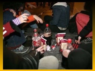 The document discusses the unhealthy effects of excessive drinking, especially among young people partying at night. It notes that while going to parties can be fun, drinking alcohol every weekend takes a toll by making people feel tired and could even lead to a hospital visit. Instead, the document encourages partying without drinking any alcohol in order to stay healthy.