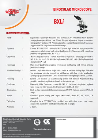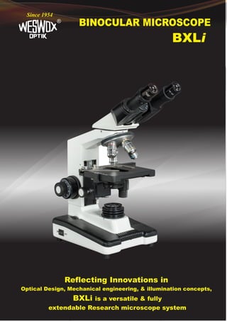 The BXLI binocular microscope, in use since 1954, features advanced optical design and is ideal for research, with multiple specifications for versatility and comfort. Key components include ergonomic design, high-resolution eyepieces, and various achromatic objectives, ensuring optimal performance. The microscope is equipped with a durable mechanical stage, sophisticated focusing system, built-in illumination, and is backed by a two-year warranty.