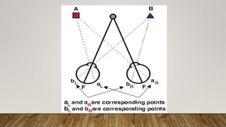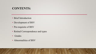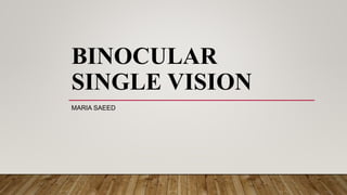 Binocular single vision (BSV) allows us to perceive a single three-dimensional image from two eyes. BSV develops in infants from 1-6 months as they learn to fuse the images from each eye. For BSV to occur, the brain must fuse the slightly different images from each eye and the visual pathways must be normal. There are different grades of BSV including simultaneous perception, fusion, and stereopsis which allows depth perception. Abnormalities can cause double vision.