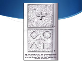 Binocular single vision refers to simultaneous vision with two eyes that occurs when an individual fixates on an object. There are three grades of binocular vision: simultaneous perception, fusion, and stereopsis. Fusion is the ability to see a composite picture from two similar images, while stereopsis provides the impression of depth by superimposing images from slightly different angles. Tests for binocular vision include those for simultaneous perception, fusion, and stereopsis using instruments like the synaptophore. Binocular vision develops through infancy and childhood as the visual axes become coordinated to direct each fovea at the object of regard.