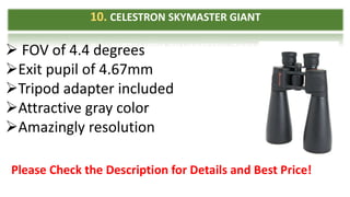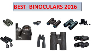 The document is a list of the best binoculars for 2016, highlighting different models along with key features such as field of view, waterproof capabilities, and warranty details. Each model is recognized for its performance and aesthetic qualities, encouraging readers to check for more information and pricing in the description. The summary includes brands like Celestron, Nikon, Bushnell, and Ortex Optics.