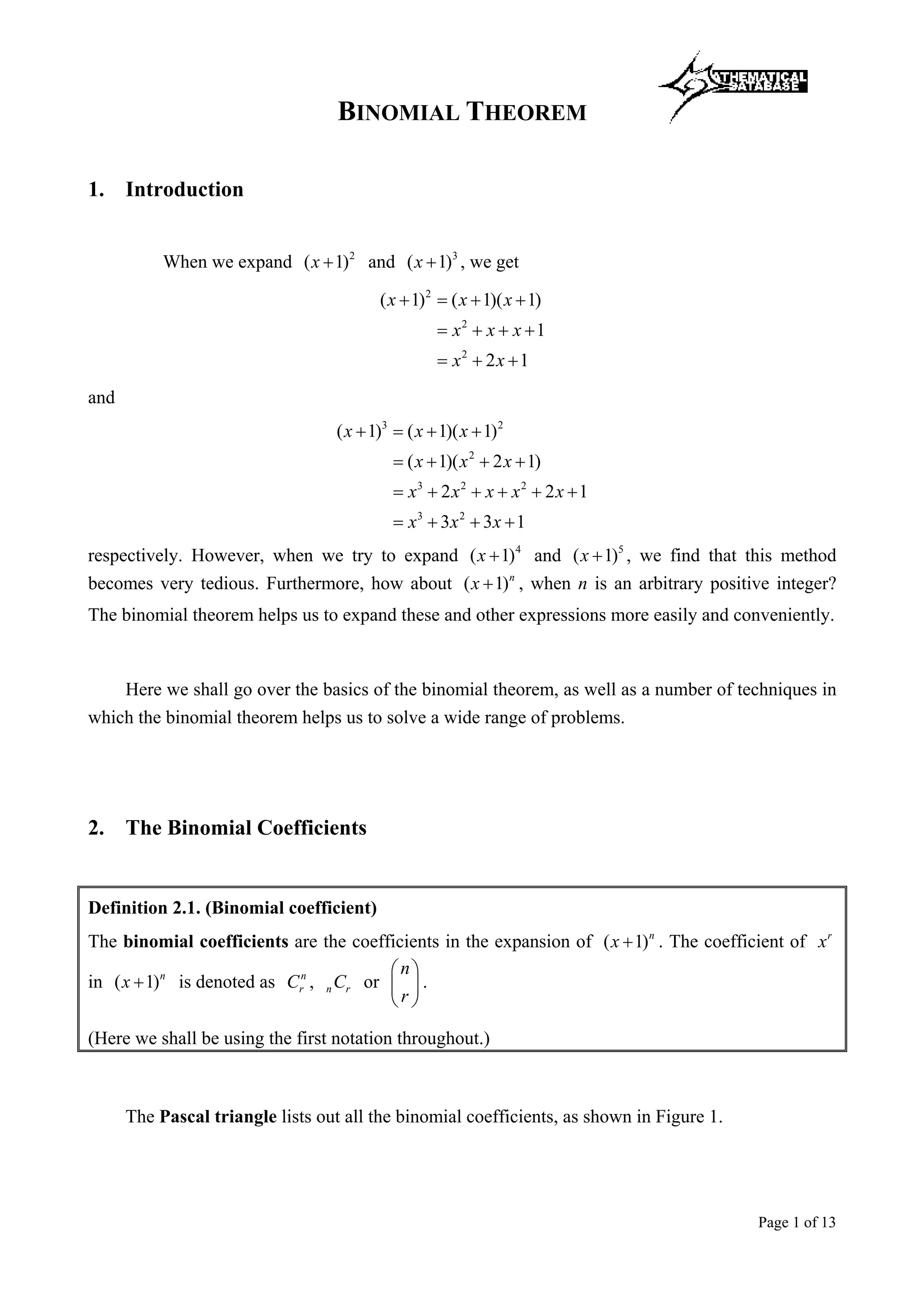 The document provides an introduction to the binomial theorem. It begins by discussing binomial coefficients through the Pascal's triangle. It then derives an explicit formula for binomial coefficients using factorials. Finally, it states the binomial theorem and provides examples of using it to expand algebraic expressions and estimate numerical values.