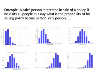 The document provides an overview of binomial distributions, detailing the characteristics of a binomial experiment and the associated probability function. It includes various examples, such as coin tosses and sales calls, to demonstrate how to calculate the probability of successes in specified trials. The document also discusses how to approximate binomial distributions to normal distributions and includes additional probability scenarios related to real-world applications.