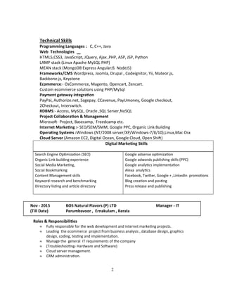 This curriculum vitae outlines Binumon George's career objective of obtaining a challenging position in a reputed firm where he can contribute his technical and management skills. It then lists his soft skills and technical skills, which include programming languages, web technologies, frameworks, content management systems, ecommerce experience, payment gateways, databases, project management tools, operating systems, cloud servers, and digital marketing skills. The CV details Binumon's employment history and roles in various companies from 2008 to the present as a project manager and leader of web development teams. It also lists his academic qualifications and personal details.