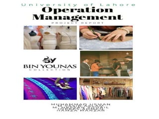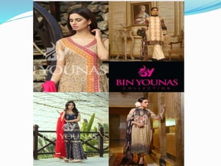 BIN YOUNAS COLLECTION is a designer garment manufacturer for females owned by Nadeem Younas. The company started in 2008 making chiffon dresses and has expanded to make unique designer dresses available across Pakistan through e-marketing and stores. The company aims to diversify its products and markets to become a complete textile unit exploring international markets. It has production facilities located in Gujranwala near other textile factories. The company focuses on creativity, development, equality, ethics and environmental care in its values and production processes including fabrication, assembly, inventory management and material planning.