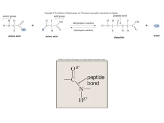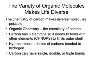 Organic molecules like carbohydrates, lipids, proteins, and nucleic acids are made up of carbon chains and functional groups that allow for great diversity. Carbon forms the backbone of these biomolecules and its ability to form single, double, or triple bonds with other elements allows it to link together into large complex structures. These molecules carry out essential functions in cells like energy storage, structure, metabolism, and information transfer. The specific sequences and structures of proteins and nucleic acids are vital to their roles.