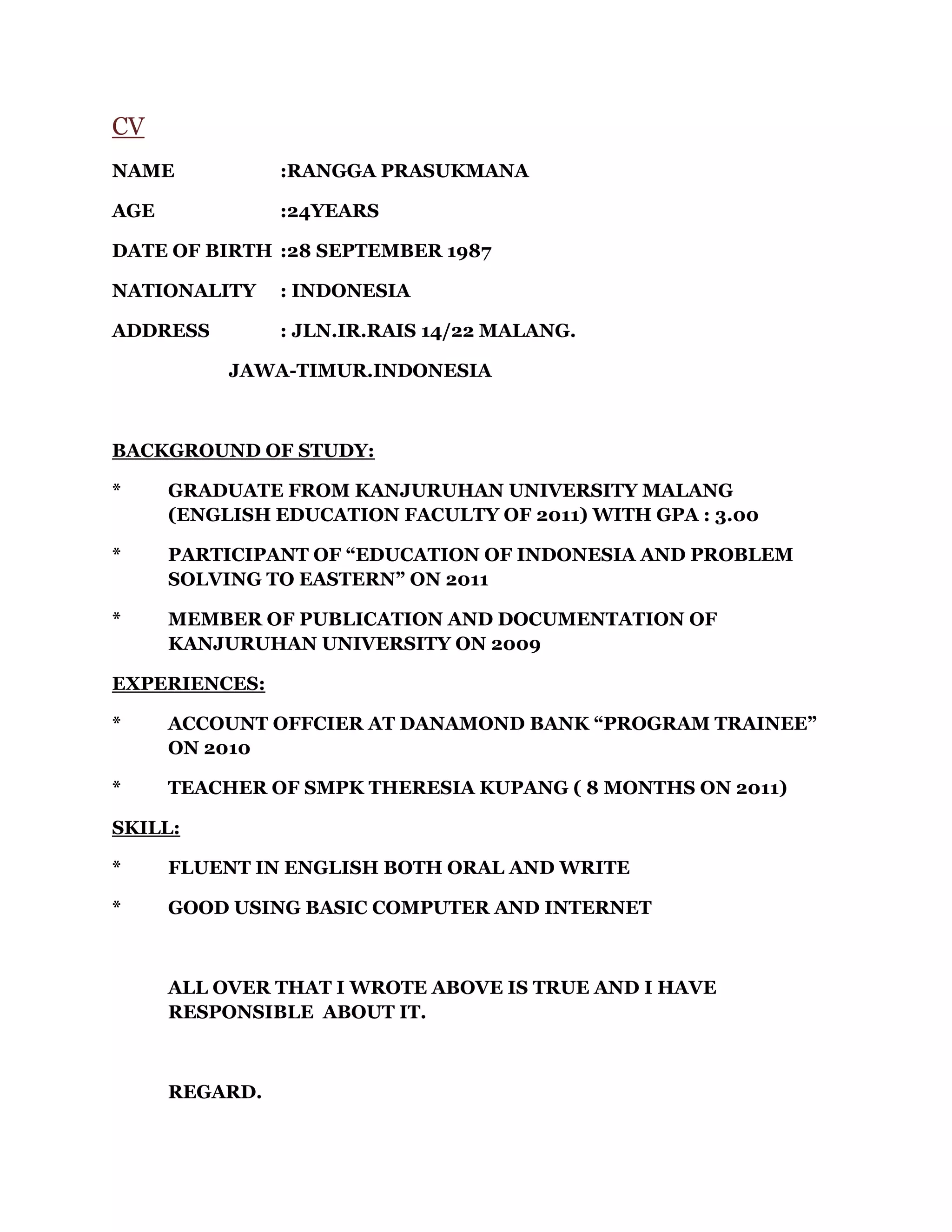 Rangga Prasukmana is a 24-year-old Indonesian man applying for a job. He graduated from Kanjurhan University in 2011 with a degree in English Education and a GPA of 3.00. He has experience as an account officer trainee at Danamond Bank in 2010 and worked as a teacher at SMPK Theresia Kupang school for 8 months in 2011. His skills include fluency in English speaking and writing as well as proficiency with basic computer and internet use.