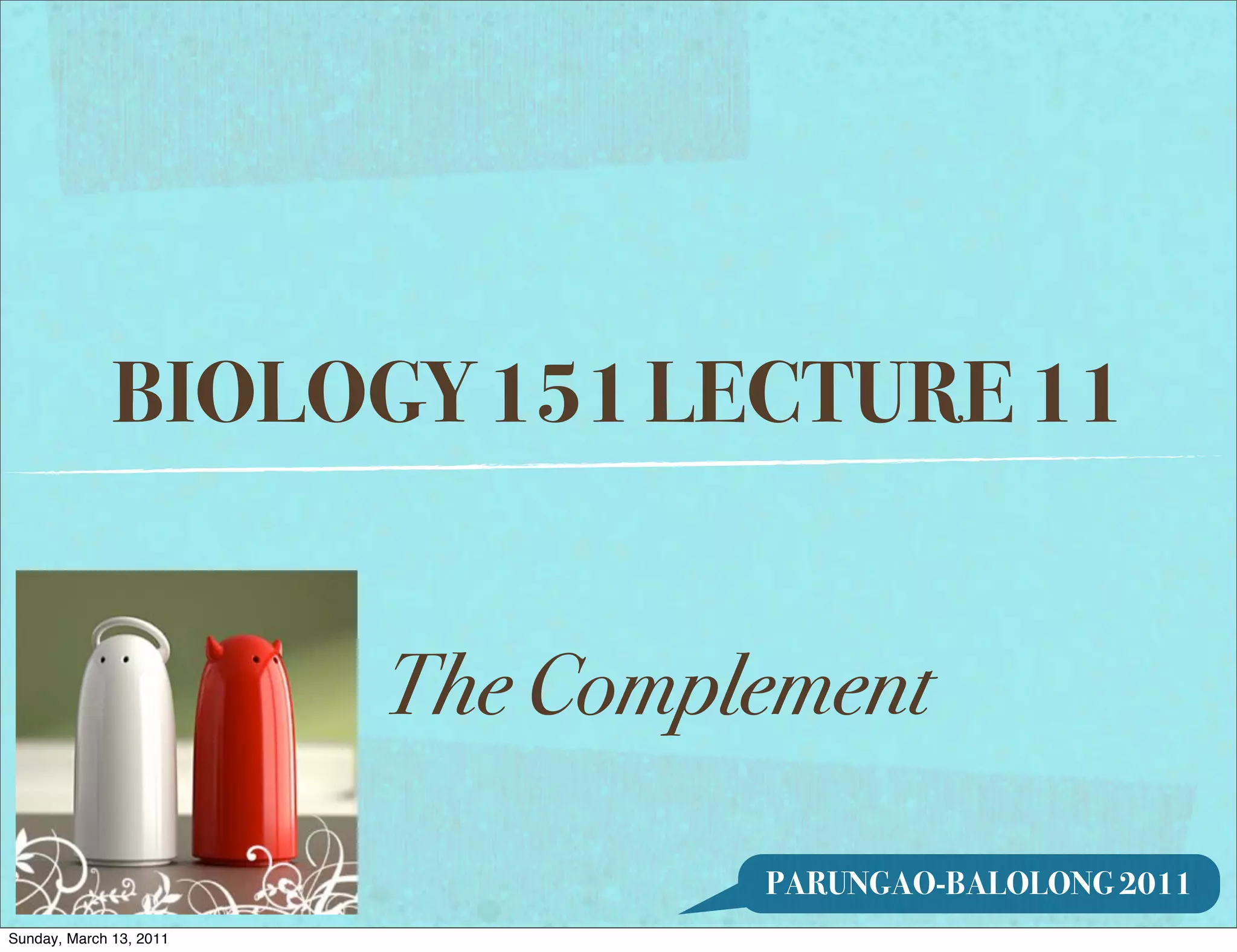 The lecture discusses the complement system, which helps antibodies combat infection. It reviews the components, activation pathways (classical, lectin, alternative), and effects of the complement cascade. Complement proteins are activated via cleavage by C3/C5 convertases, ultimately forming the membrane attack complex to lyse microbial cells. However, some microbes have evolved ways to evade complement-mediated killing.