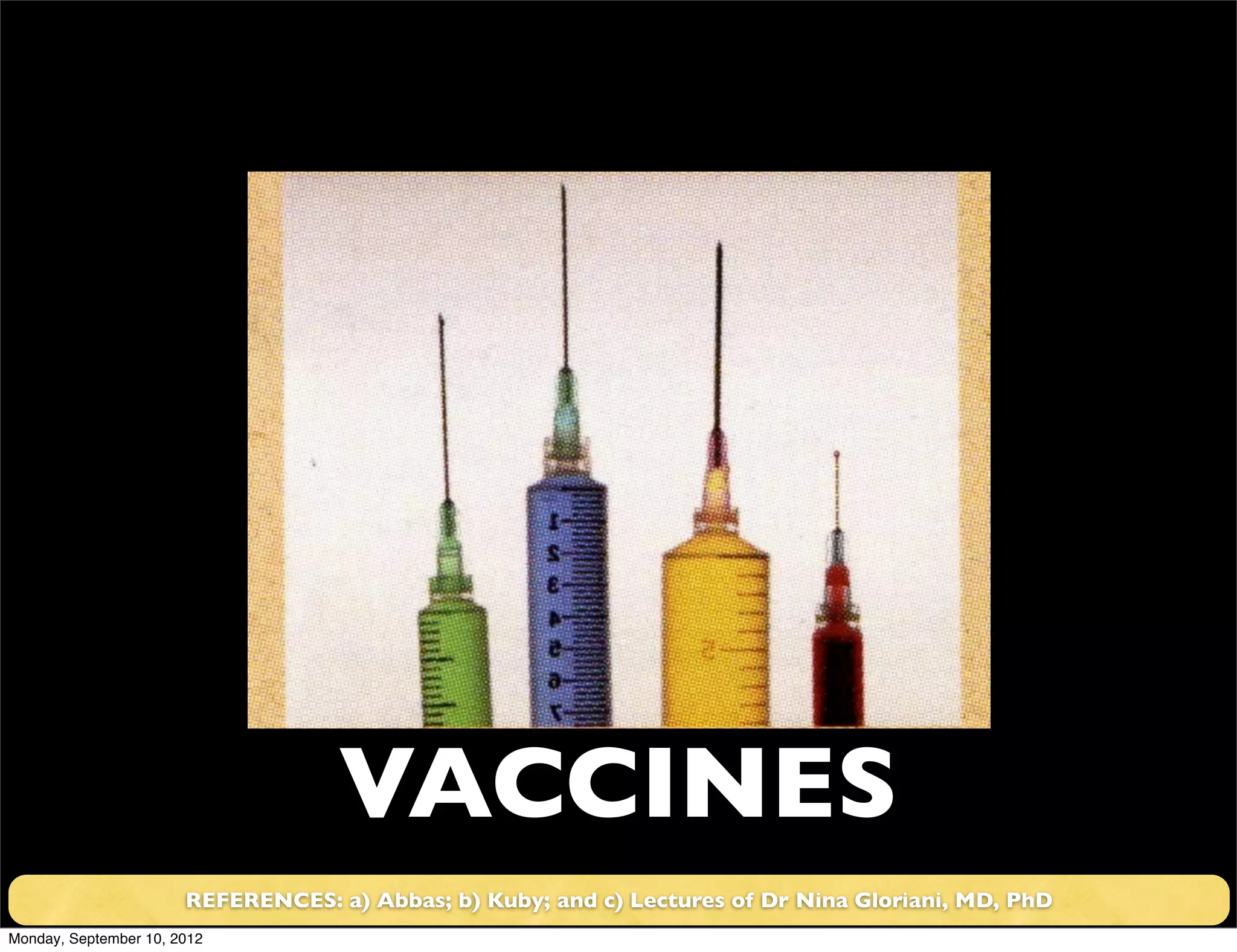The document discusses the history and development of vaccines from Edward Jenner's pioneering smallpox vaccine in the 18th century to modern vaccines. It covers key topics such as passive and active immunity, commonly used vaccine types including live attenuated, killed/inactivated, subunit/component, toxoid, and DNA vaccines. Safety considerations, efficacy, target groups, and monitoring of vaccine effects are also addressed.