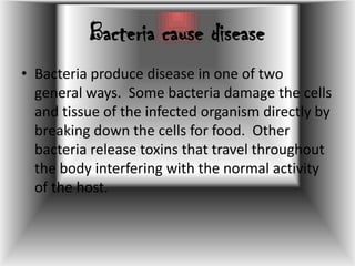 Bacteria and viruses cause disease in different ways. Bacteria can directly damage cells and tissues for food or release toxins that interfere with the host's normal functions. Viruses disrupt the body's equilibrium by attacking and destroying cells, causing symptoms. There are methods to control bacteria like sterilization and disinfectants, while viral infections damage cells and disrupt the body's normal functioning.
