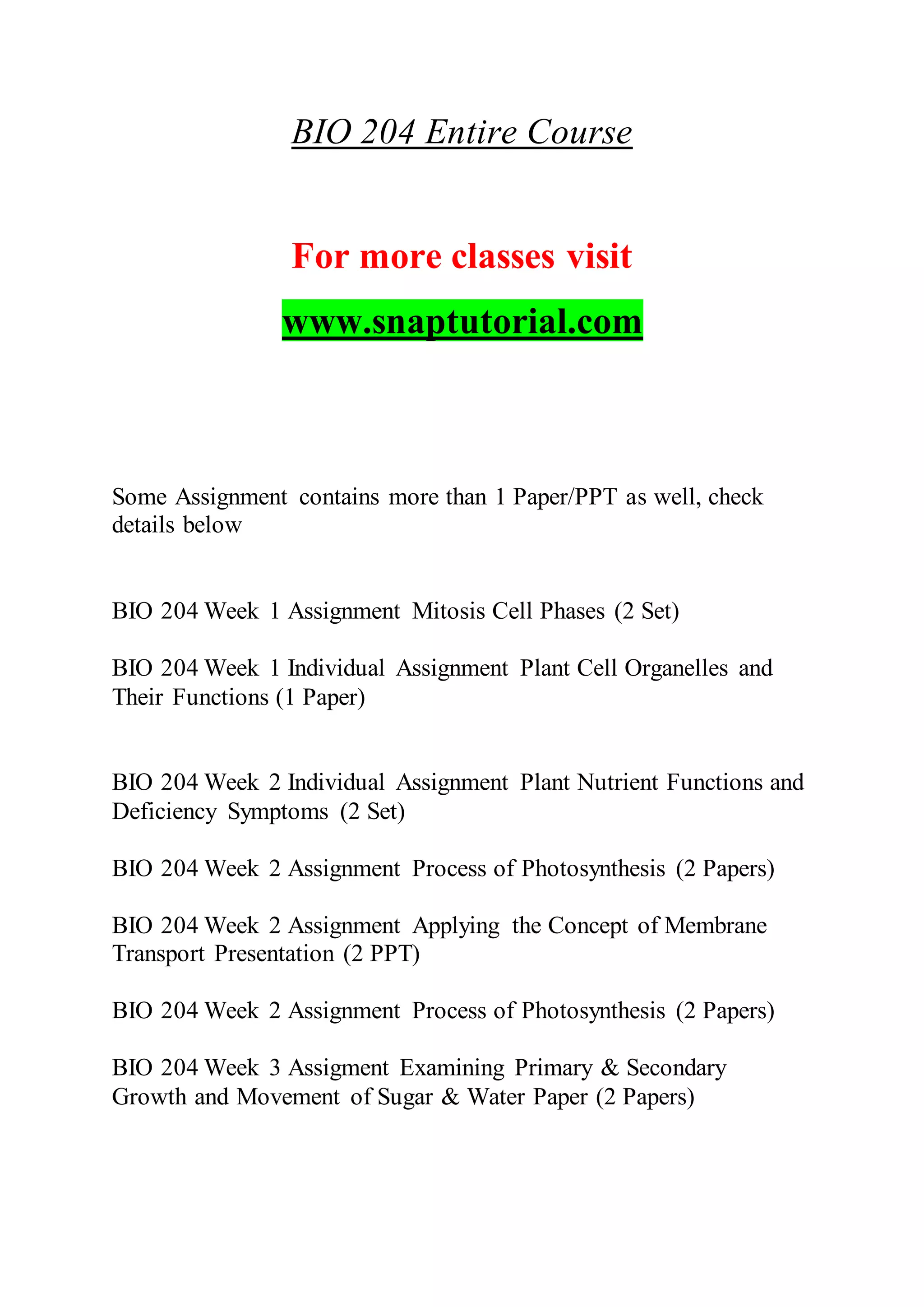 This document outlines the assignments for an entire BIO 204 course. It includes assignments on topics like mitosis, plant cell organelles, photosynthesis, plant growth and anatomy. Each week covers 1-2 individual or group assignments involving writing papers, creating presentations, or completing tables. The assignments require explaining and diagramming key biological concepts and are to be completed and submitted for grading over the course of the term.