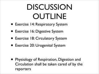 The document provides an outline and discussion of post-laboratory exercises covering the respiratory, digestive, circulatory, and urogenital systems. It discusses key aspects of each system, including respiration and the respiratory organs and processes in various animal kingdoms. For the digestive system, it covers the major organs and their histology as well as important digestive hormones and facts. The circulatory system section compares open and closed systems. It also outlines the heart, blood vessels, and circulatory system of frogs. Finally, it provides an overview of the urogenital system and its excretory and reproductive functions.