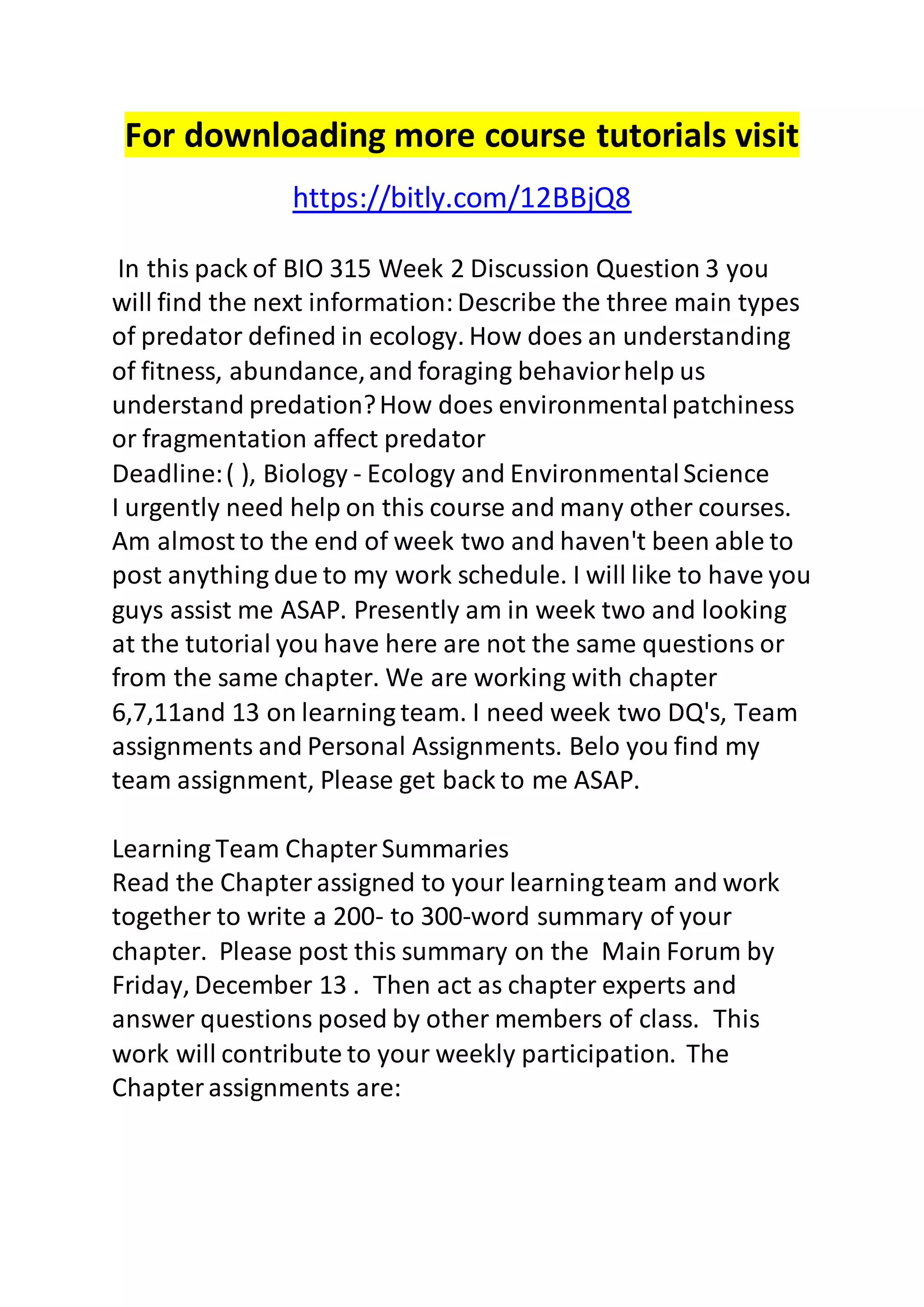 This document discusses assistance needed for Biology coursework including discussion questions, team assignments, and personal assignments from weeks 2, 6, 7, 11, and 13. It provides information on the learning team assignment to write a 200-300 word summary of the assigned chapter and act as chapter experts to answer classmates' questions. It also includes a link for additional course tutorials and encourages seeking career counseling or academic advising to help choose the right school and program.