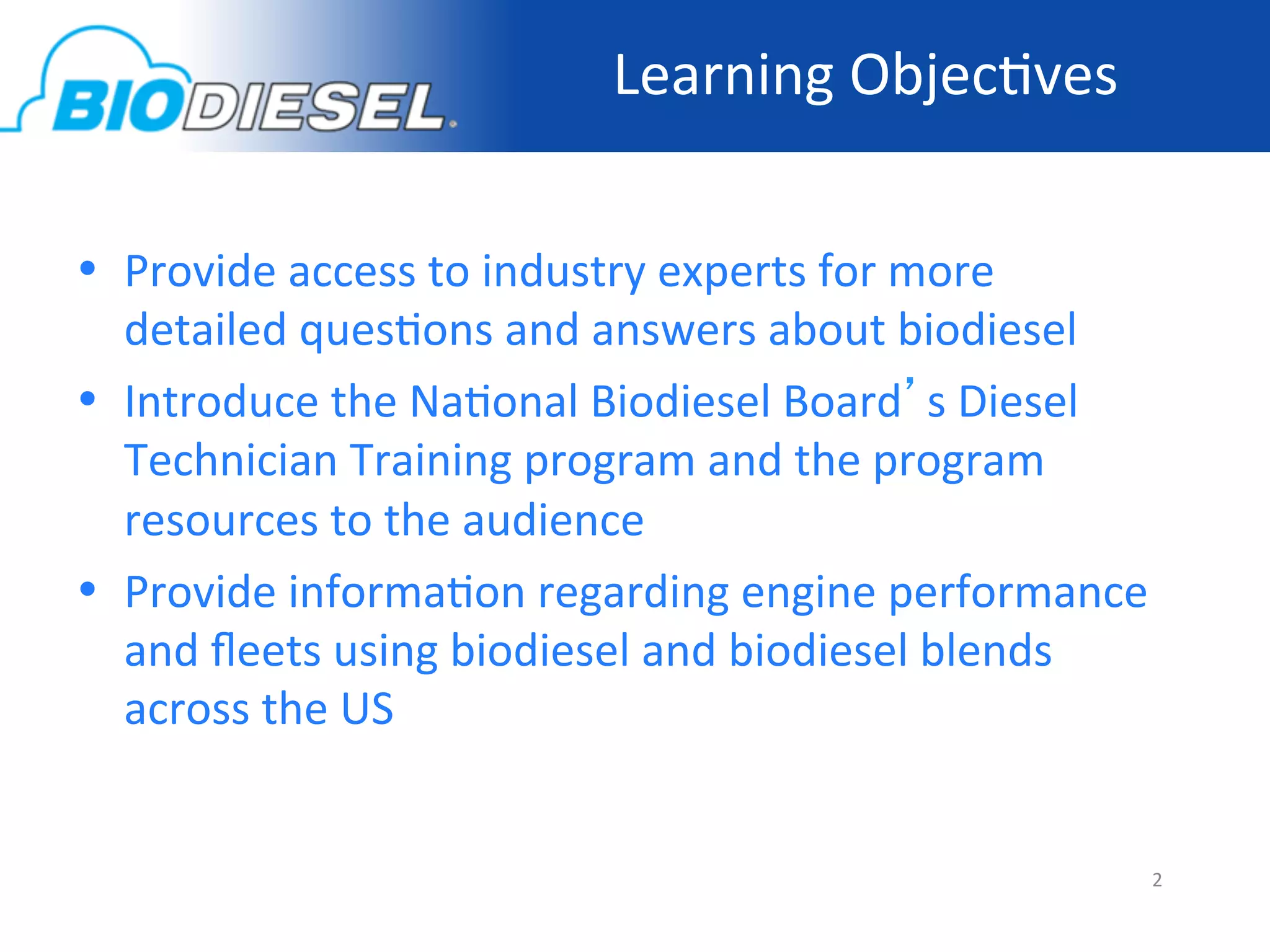 This document provides an overview of a training course on biodiesel engine and fleet performance presented by the National Biodiesel Board. The objectives are to provide expert answers on biodiesel use, introduce diesel technician training resources, and discuss fleet experiences with biodiesel. Key topics covered include biodiesel properties, engine manufacturer positions on biodiesel blends, and technical guidance from a biodiesel evaluation team on ensuring proper fuel quality and maintenance practices when adopting biodiesel.