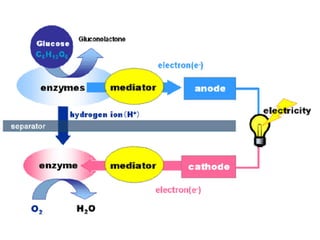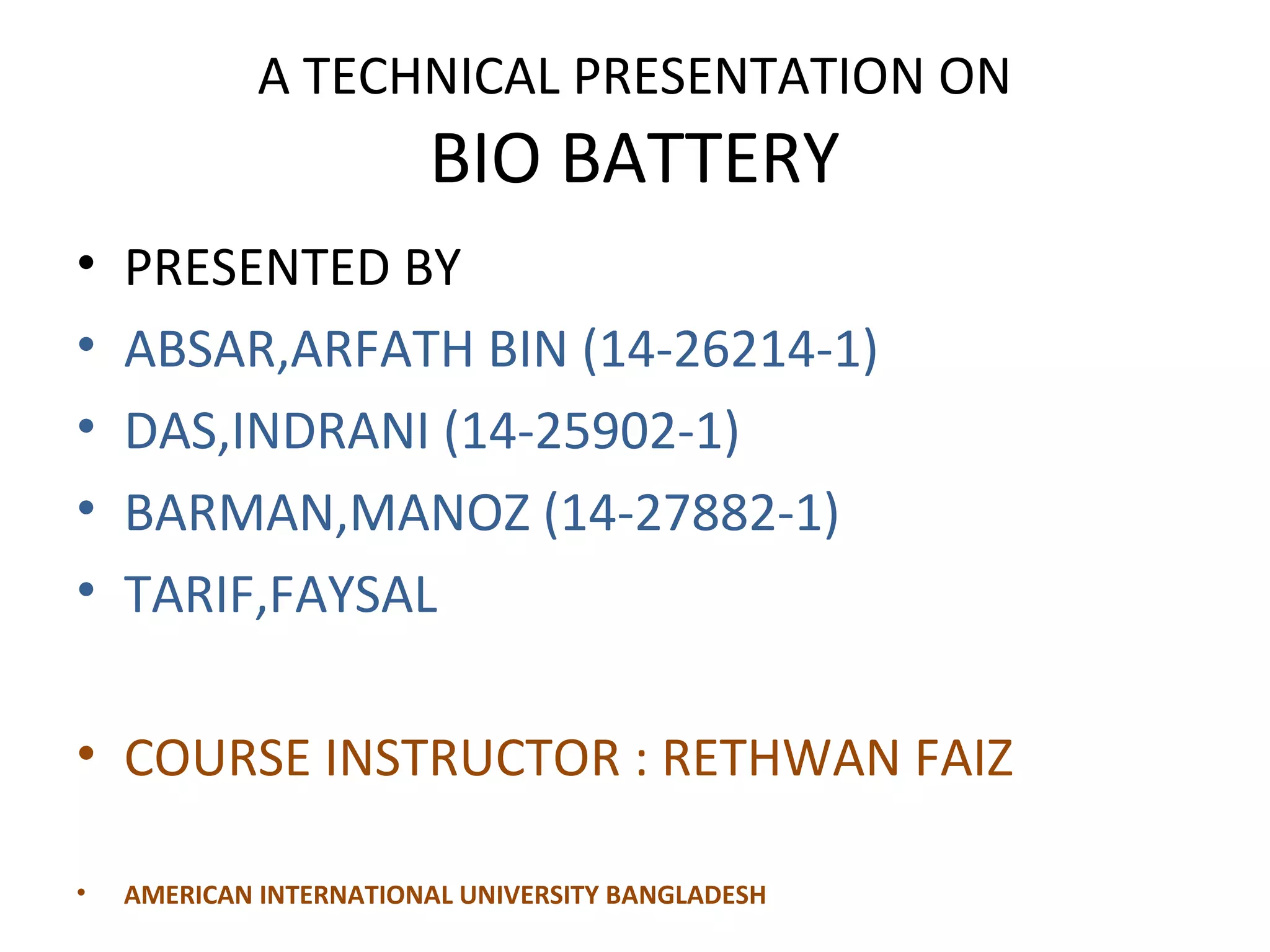 This technical presentation discusses bio batteries. Bio batteries use enzymes to break down glucose from sources like human blood to directly produce energy, which is then stored in the battery. Bio batteries consist of an anode, cathode, electrolyte and separator. They have advantages over other batteries like being able to recharge instantly through a constant glucose supply, and being non-flammable and non-toxic. However, bio batteries currently cannot retain energy as long as conventional batteries. Researchers continue working to improve bio batteries as a renewable and environmentally friendly energy source.