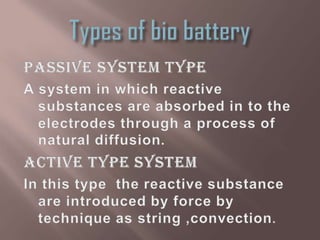 Bio-batteries use enzymes to convert glucose into electrical energy through a process called enzymatic hydrolysis. This allows bio-batteries to continuously recharge through a constant glucose supply without needing an external power source, making them a renewable and non-toxic fuel source. However, bio-batteries currently do not retain energy as well as conventional batteries over long periods of usage and storage. Researchers are working to improve bio-batteries to make them a more practical alternative energy source.