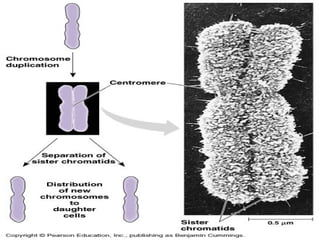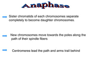 The document summarizes the key events of mitosis and cytokinesis. It describes how sister chromatids separate during anaphase and move towards opposite poles. During telophase, chromosomes decondense and nuclear envelopes reform. Cytokinesis then divides the cytoplasm, with animal cells forming a cleavage furrow and plant cells forming a cell plate. Mitosis and cytokinesis are important for growth, repair, and development in multicellular organisms.