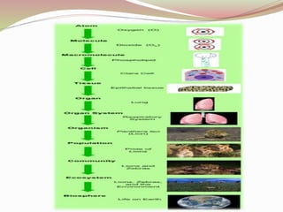 Biology is the study of living organisms and their interactions. The document outlines the definition of biology, its major divisions (botany, zoology, microbiology), and branches such as anatomy, physiology, genetics, and molecular biology. It also discusses how biology relates to other sciences like physics, chemistry, mathematics, and discusses levels of biological organization from atoms to ecosystems. Finally, it notes how the Quran instructs humans to study and reveal knowledge about the origins and characteristics of life.