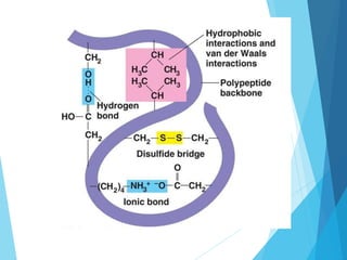 - The four levels of protein structure - primary, secondary, tertiary, and quaternary structure. Secondary structure includes alpha helices and beta sheets.