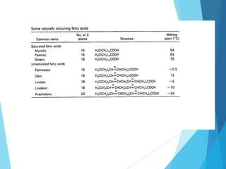 - The main types and functions of lipids like triglycerides, phospholipids, and sterols. Triglycerides are the main form of lipids and dietary fats.