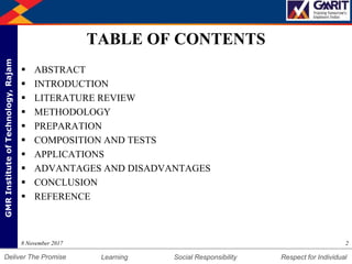 This document summarizes a student project on bio concrete. It includes an abstract stating that bacteria are added to concrete to improve its properties and durability by allowing it to self-heal cracks. It then reviews literature on bacterial concrete and describes the methodology, preparation, composition, and testing of bio concrete. The tests show that bio concrete has higher compressive, tensile, and flexural strength than conventional concrete. Applications discussed include using bio concrete to line irrigation canals in Ecuador to improve water retention.