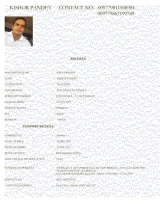 Kishor Pandey is applying for the position of site foreman. He is a 35-year-old Nepalese man who has been working as a site foreman for Multiforms LLC since 2006, where he installed and maintained aluminum, UPVC doors, windows, and glass. He holds an S.S.L.C. education qualification and speaks English, Hindi, and Nepali.