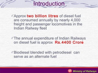 The document discusses the Indian Railways' consideration of using biodiesel as a traction fuel. It notes that Indian Railways consumes approximately 2 billion liters of diesel fuel annually. Biodiesel blended with petrodiesel can serve as an alternative fuel. The document outlines Indian Railways' diesel locomotive fleet, the key advantages of biodiesel, land requirements and raw material sources to produce enough biodiesel to meet their needs. It also discusses quality standards, initiatives in other countries, policies needed in India, research and development areas, and expectations of the biodiesel industry to support adopting biodiesel use.