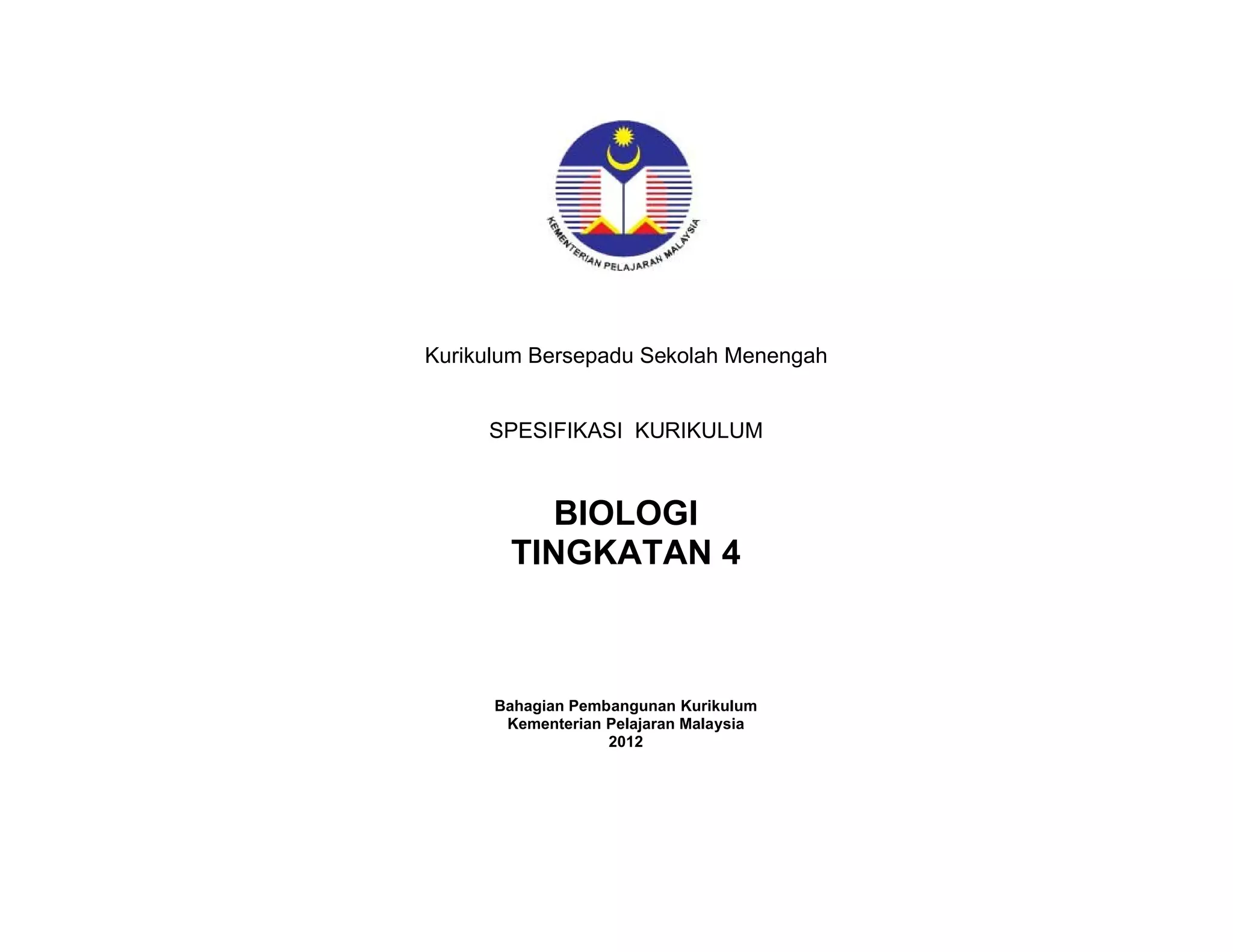 Dokumen ini adalah spesifikasi kurikulum biologi tingkatan 4 yang diterbitkan oleh Kementerian Pelajaran Malaysia, bertujuan untuk membekalkan pengetahuan dan kemahiran sains kepada murid. Kurikulum ini menekankan pembelajaran berasaskan inkuiri dan penguasaan kemahiran saintifik untuk membantu pelajar memahami fenomena alam dan aplikasinya dalam kehidupan seharian. Selain itu, ia juga membina nilai murni dan semangat patriotisme dalam kalangan pelajar.