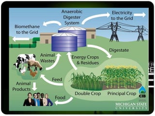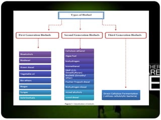 This document discusses biofuels, which are fuels produced from biological sources such as plants and waste. It describes various types of biofuels like ethanol, biodiesel, biogas, and their production methods. Ethanol is made from crops like corn and sugarcane, while biodiesel is made from vegetable oils or animal fats. The document also covers generations of biofuels and ongoing research into producing biofuels from new sources like algae and microbes.