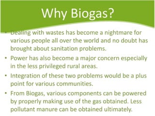 Biogas can be generated from organic wastes through anaerobic digestion to provide a renewable source of energy. It has the benefits of dealing with waste management issues while also producing a clean fuel for cooking, lighting, electricity and transportation. The biogas production process involves several steps of hydrolysis, acidogenesis, acetogenesis and methanogenesis by which bacteria break down biomass into methane and carbon dioxide gas. Common feedstocks and their expected biogas yields are listed to evaluate production potential from various resources.
