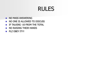 This document contains the rules and questions for a biology jeopardy game. It lists the categories and dollar values for the questions. The questions cover topics about biodiversity, national parks, threatened species, wildlife in India, definitions of key biology terms, and scientists who proposed early theories of cells. The final jeopardy question asks about the role of cellulose in the plant cell wall and human diet.