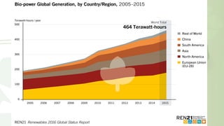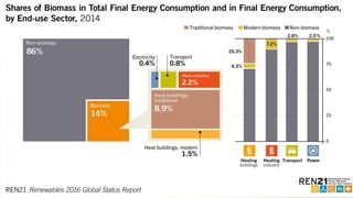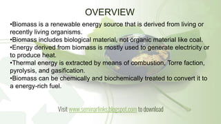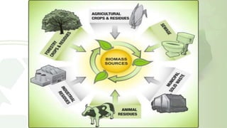 Biomass is a renewable energy source derived from living organisms, primarily used for electricity generation and heat production, with its contribution to global energy supply growing steadily. It has the potential to supply nearly 50% of the world's total energy demand sustainably, while facing challenges such as land availability and market organization. Despite its advantages in reducing fossil fuel dependence and greenhouse gases, barriers like inadequate information and rising costs hinder the realization of biomass energy's full potential.