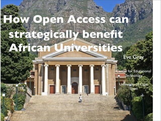 This document discusses how open access can strategically benefit African universities. It notes that currently, Africa is viewed primarily as a consumer rather than producer of knowledge, undermining partnerships and indigenous knowledge. Open access is presented as an answer by overcoming barriers to distribution and access, and working across the entire publishing ecosystem including journals, books, cooperative platforms, repositories, and African research centers. The key question is how to build a scholarly communication policy that addresses the whole ecosystem and allows Africa to both produce and share knowledge.